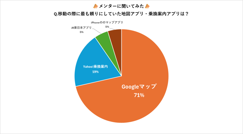 参考までに、メンターが使用していた地図アプリも聞いてみました。Googleマップを使用している人が多いようですね。