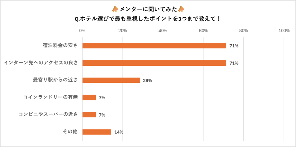 他にも、「着慣れたパジャマ」「(ホテルの歯ブラシは柔らかすぎるため、)愛用歯ブラシ」といった回答がありました。インターンシップでの必需品だけでなく、ホテルでリラックスできる環境を整えらえるよう、工夫しているようですね。